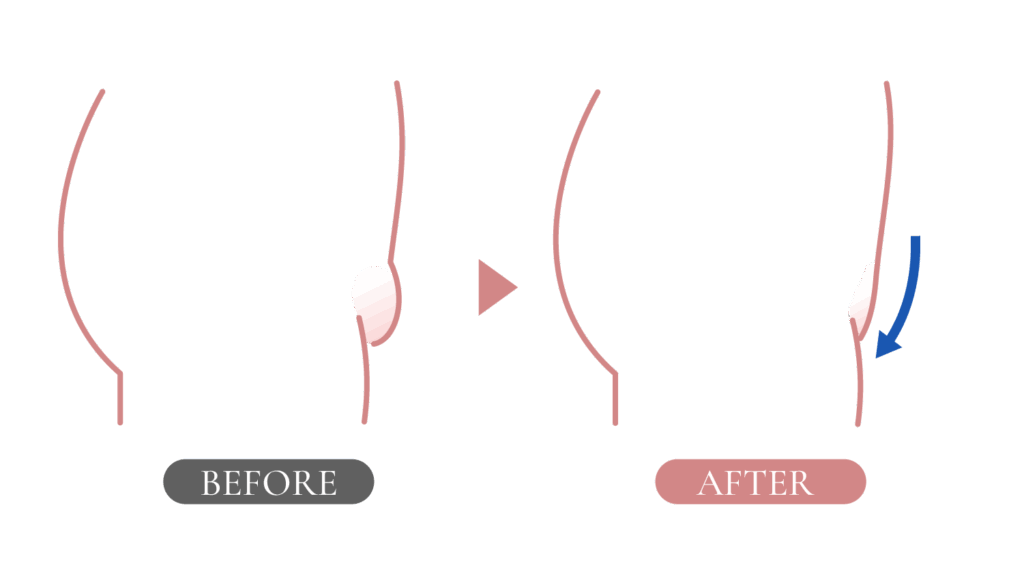 膨らみは、「モリマン」や「ドテ高」などと呼ばれることもあり、脂肪が多くついている場合や骨格によるものもあります。恥骨部全面の脂肪をなるべく除去することで、骨格が原因でもかなりすっきりし、横になっても膨らみがなく平らな状態に近づきます。